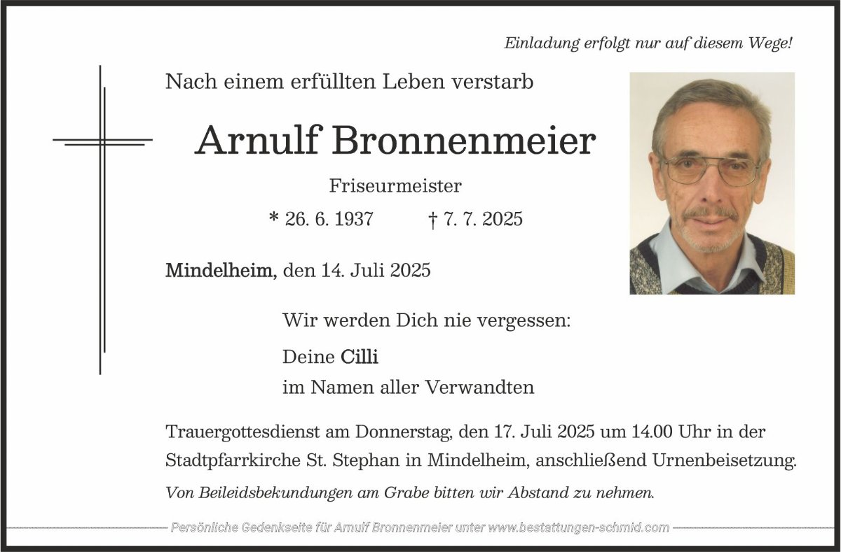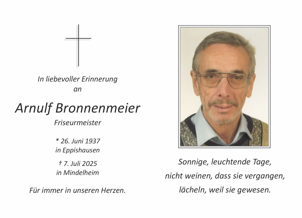 Lieber Arnulf, wir durften dich als einen ehrlichen, fleißigen und sehr aufgeschlossenen stolzen Friseur-Meister und Gartenliebhaber kennen lernen. Du warst stets gut drauf und immer fleißig am Haus und Garten. Das alles geregelt und gepflegt war und dass es der Cilly gut geht, war dir sehr wichtig. Danke für die gemeinsame Zeit und nette Gespräche. Du hattest ein langes erfülltes Leben und nun wünschen wir dir, dass du oben gut angekommen bist. Deine Familie Keppeler und Ramerth