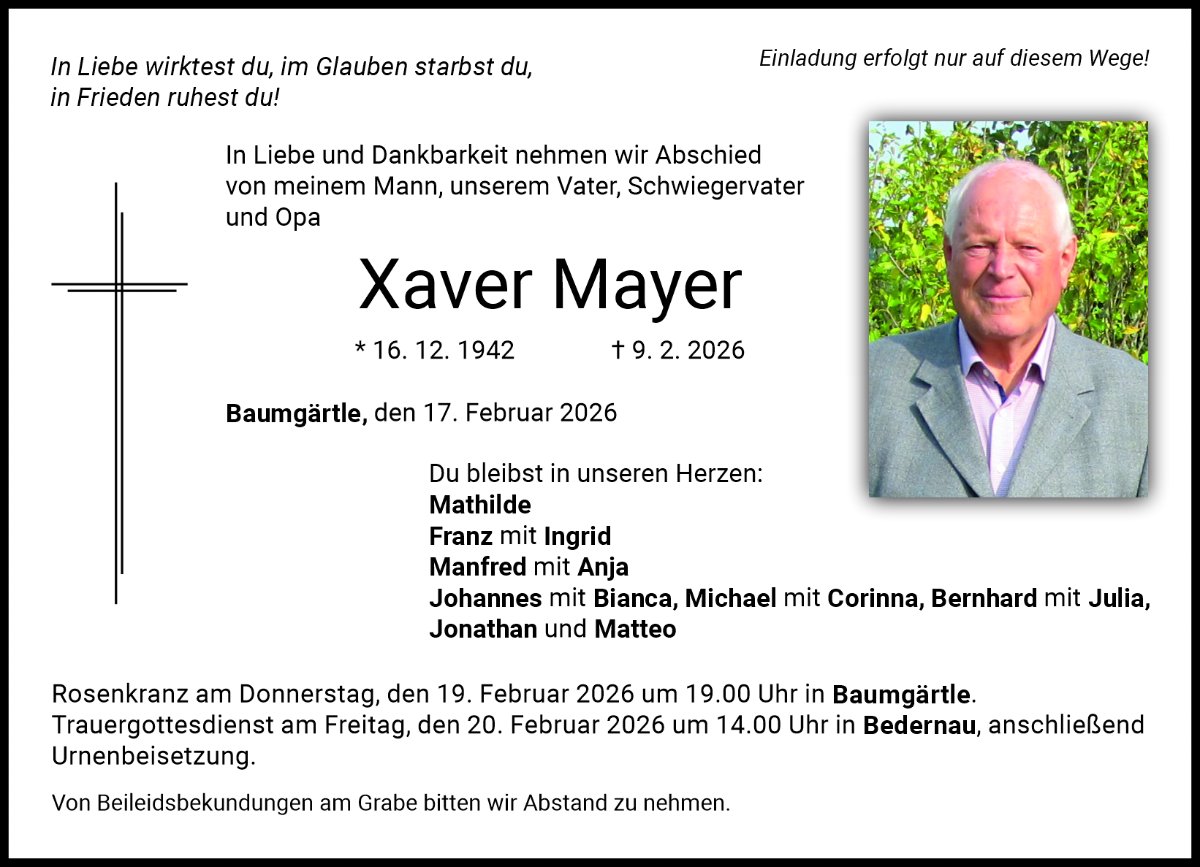 Trauergottesdienst am Freitag, den 20. Februar 2026 um 14.00 Uhr in Bedernau, anschließend Urnenbeisetzung.
